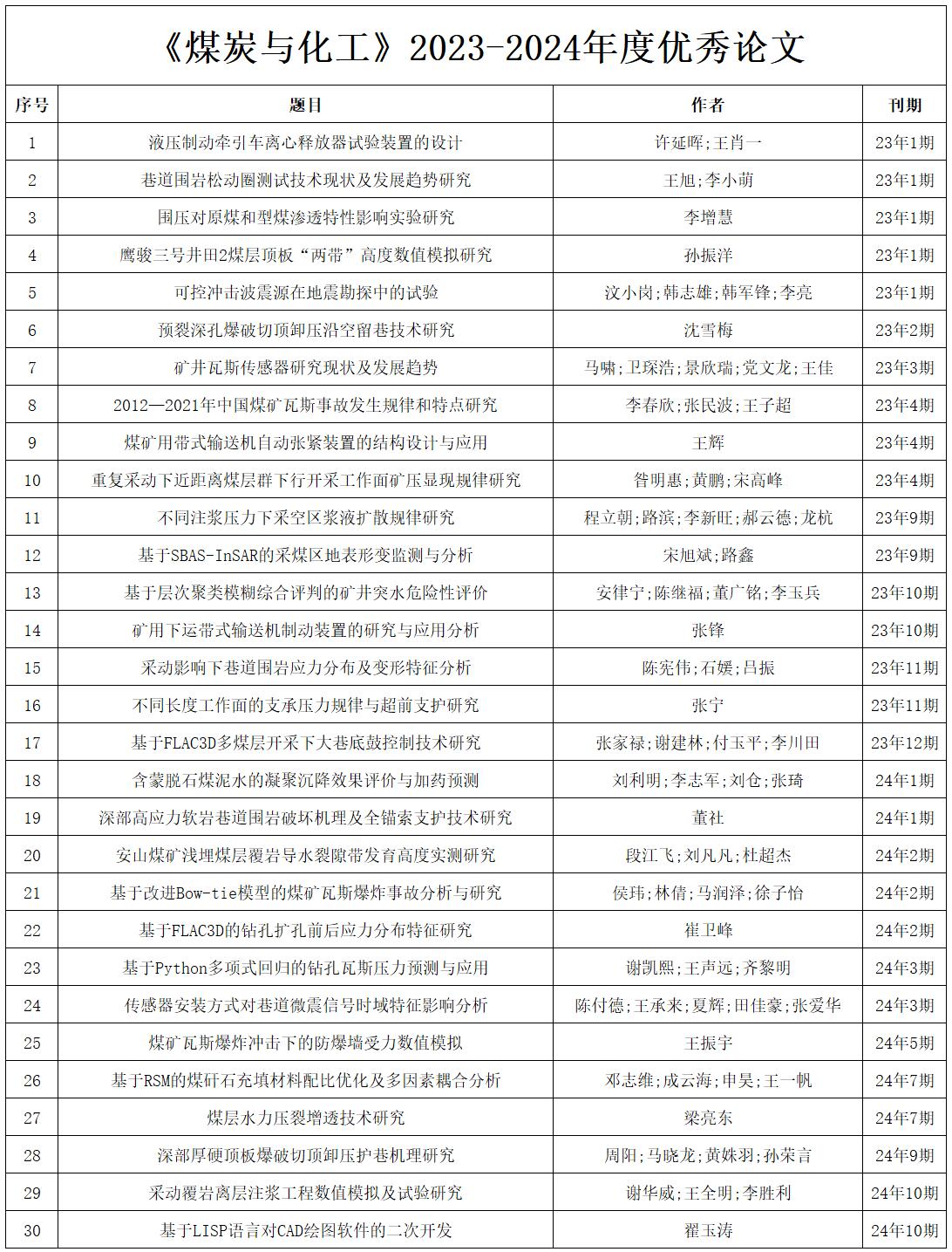 为鼓励更多作者积极展示优秀科研成果,促进煤炭与化工领域优秀成果的传播与交流,按照被引用次数、下载量、热点选题方向等综合指标,并结合专家评审结果,从《煤炭与化工》2023年—2024年刊出的论文中,评选出30篇优秀论文。祝贺入选论文作者及其团队,并向所有支持本刊的作者表示感谢!编辑部将向优秀论文作者颁发荣誉证书。
